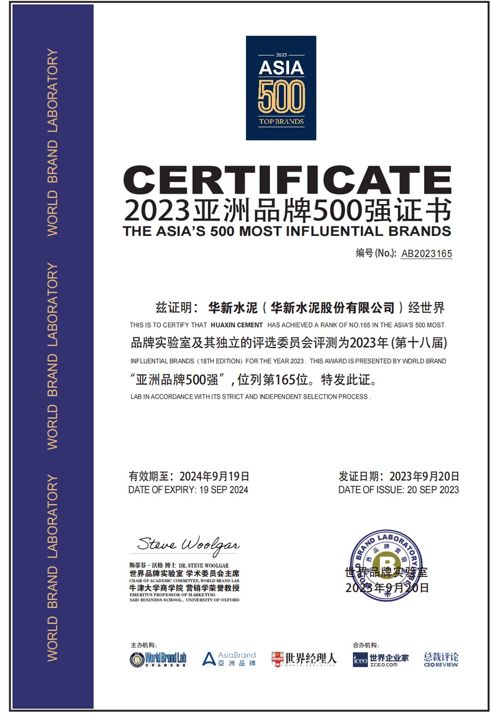 9月20日,世界品牌实验室(World Brand Lab)主办的“亚洲品牌大会”在香港召开,会上发布了2023年《亚洲品牌500强》排行榜。华新水泥连续第八年入选亚洲品牌500强,位列第165名,排名稳步上升。