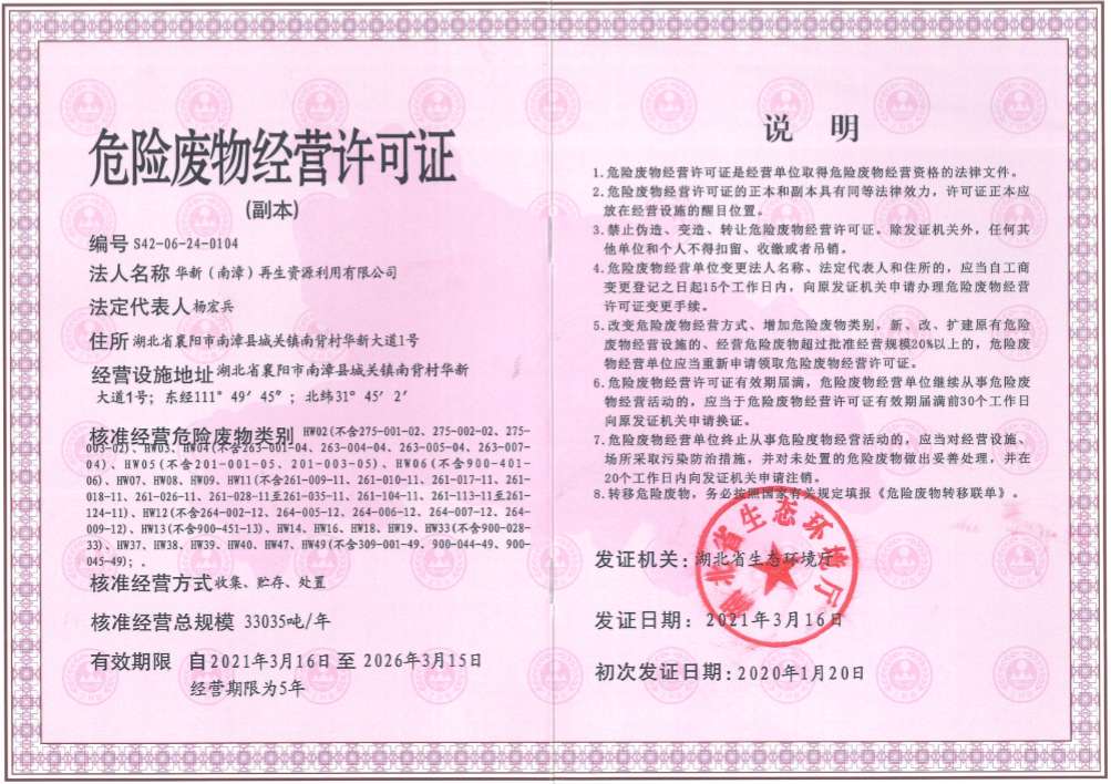 根据《中华人民共和国清洁生产促进法》和《清洁生产审核办法》(环保部令38号)湖北省生态环境厅文件鄂环发【2021】29号等有关规定,将华新(南漳)再生资源利用有限公司列入2021年度强制性清洁生产审核重点企业的名单,华新(南漳)再生资源利用有限公司已委托武汉国宇环保技术有限公司做清洁生产审核服务,完成时间2021年11月30日之前。现将营业执照副本、危险废物经营许可证、华新南漳危废处置环评报告书、环境影响报告书的批复,竣工环境保护验收,验收意见和其他需要说明的事项公示(详见附件)。